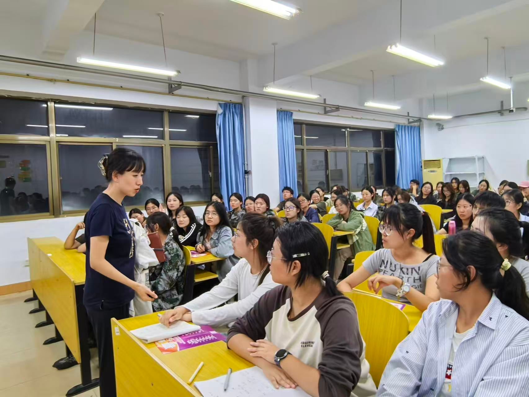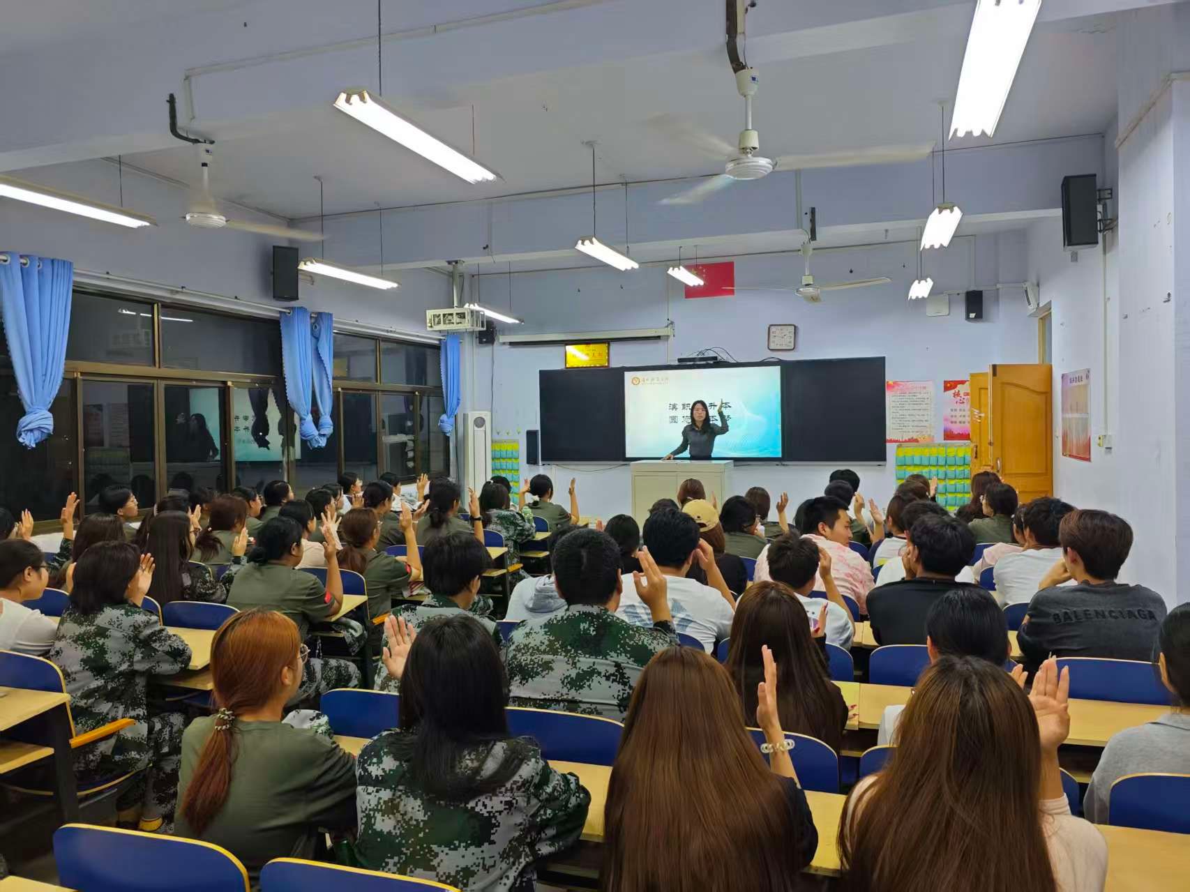 互动答疑环节更是热闹非凡。同学们纷纷举手提问,问题集中在 “缴费时间是否有明确节点”“不同模块课程能否灵活调整上课时间”,还有同学关切询问 “公办院校录取数据能否再细化”“是否有学长学姐分享备考技巧”。宣讲老师逐一耐心解答。不少同学听完答疑后,当场与身边同学交流报考意向,部分同学还留下联系方式,咨询后续报名细节,报名积极性十足。