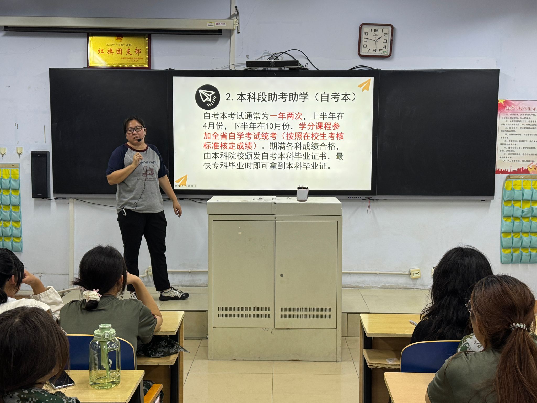 宣讲会上,先以清晰的流程图和数据对比,为同学们梳理了校内专升本培训与自考本助学两大核心路径。校内专升本强调 “进阶式” 培养,从基础夯实到冲刺强化层层递进,还提及高录取率与公益收费优势;自考本则突出与山东财经大学合作的正规性、弹性学制及高性价比,让大家快速把握两种路径的核心亮点。讲解过程中,不少同学边听边记,及时记录课程安排、收费标准等关键信息,现场学习氛围浓厚。