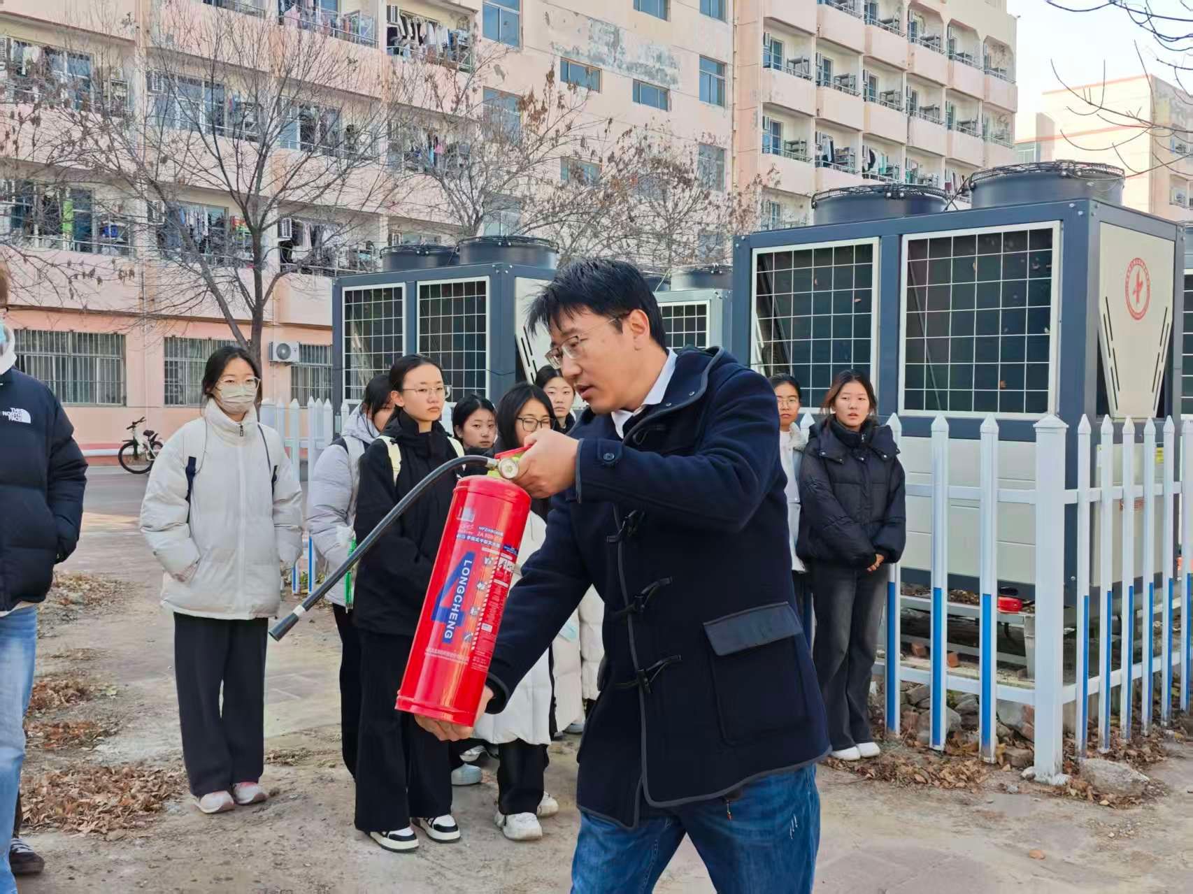 10时许,七号楼公寓楼前集合区域内,全体人员整齐列队。保卫处工作人员结合宿舍消防痛点展开讲解,针对电器线路老化、违规抽烟等常见隐患,细致剖析潜在危害与排查方法。10时20分,演练总指挥一声令下,公寓楼道内烟雾弹释放,浓烟迅速弥漫,警报声同步响起。公寓管理员即刻启动应急响应,引导员工冷静应对:携带备用防毒面罩的员工规范佩戴,未携带的则用毛巾捂鼻,全体人员弯腰低姿沿预定安全线路有序疏散。辅导员提前在疏散楼梯口、楼栋出口值守,实时疏导人流、提醒安全间距,有效规避拥挤踩踏风险。最终,全体员工均按时撤离至指定区域,各班级迅速清点人数并向总指挥汇报,全过程紧张有序、规范高效。随后,保卫处工作人员现场示范灭火器“提、拔、握、压”操作步骤,讲解不同火情适配的灭火器材及安全扑救距离,指导员工分组实操,纠正握姿、喷射角度等细节问题,确保人人掌握初期灭火技能。